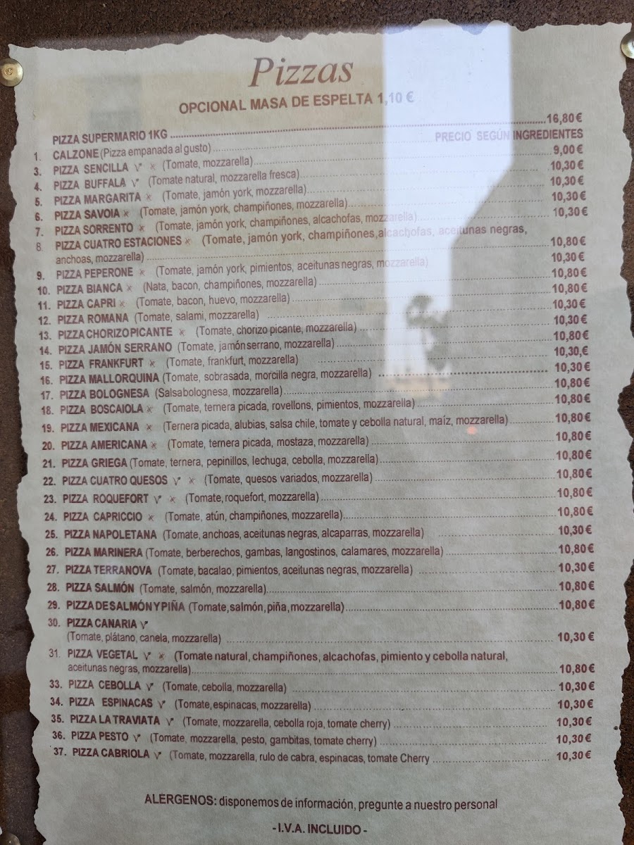 Sin gluten masa con trigo sarraceno. Tomate, jamón york, champiñones, mozzarella, olivas, anchoas, alcachofas, orégano